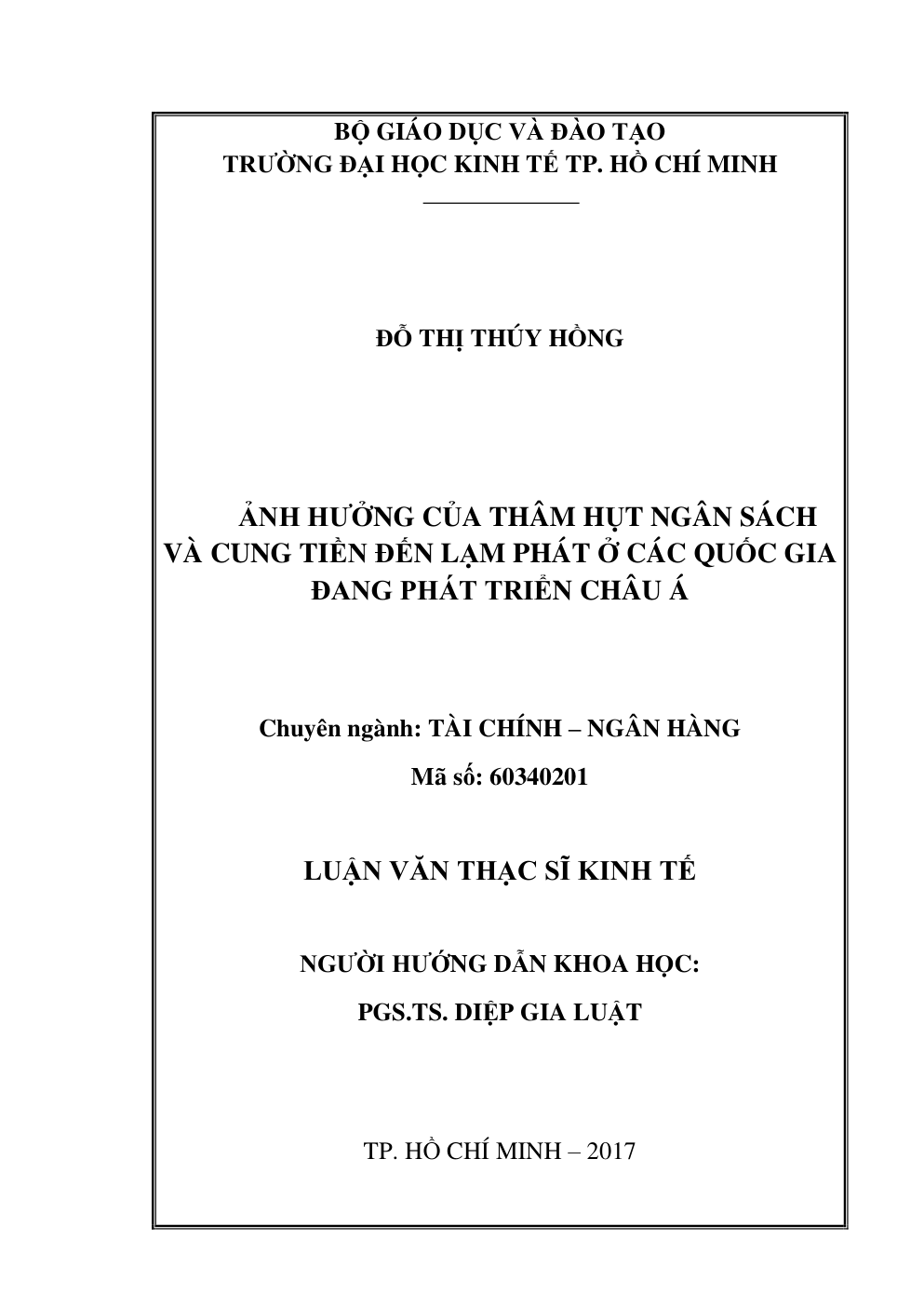 • Tên Luận văn: Ảnh hưởng của thâm hụt ngân sách và cung tiền đến lạm phát ở các quốc gia đang phát triển châu Á