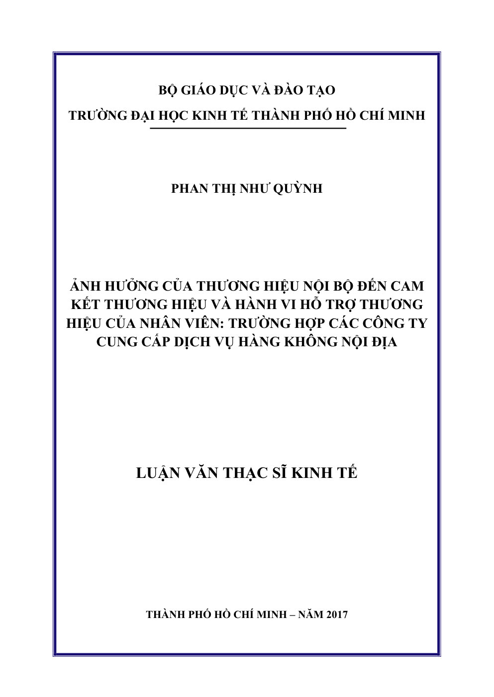 - Tên Luận văn: Ảnh hưởng của Thương hiệu nội bộ đến Cam kết thương hiệu và Hành vi hỗ trợ thương hiệu của nhân viên: Trường hợp các công ty cung cấp dịch vụ hàng không nội địa