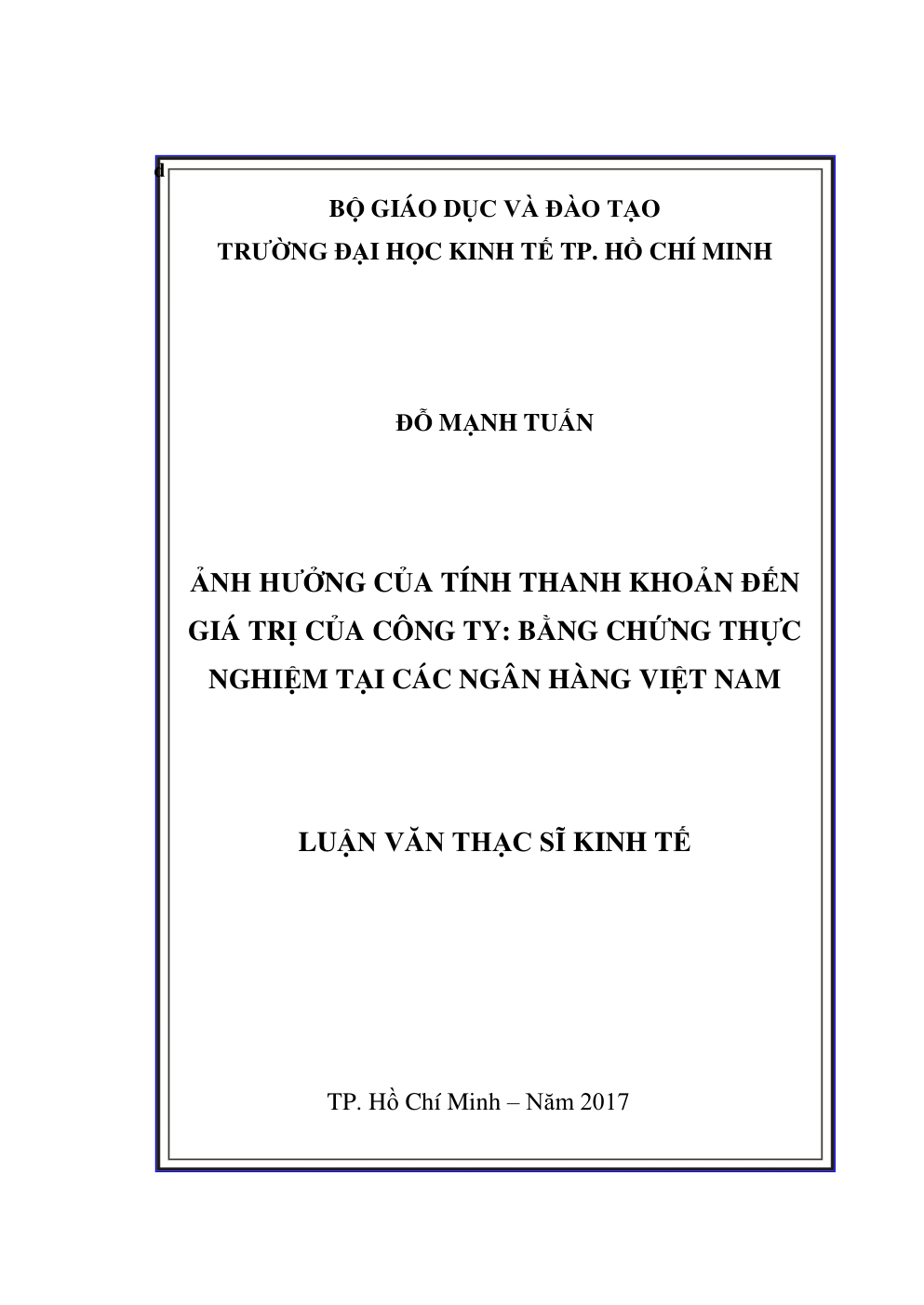 • Tên Luận văn: Ảnh hưởng của tính thanh khoản đến giá trị của công ty: Bằng chứng thực nghiệm tại các ngân hàng Việt Nam