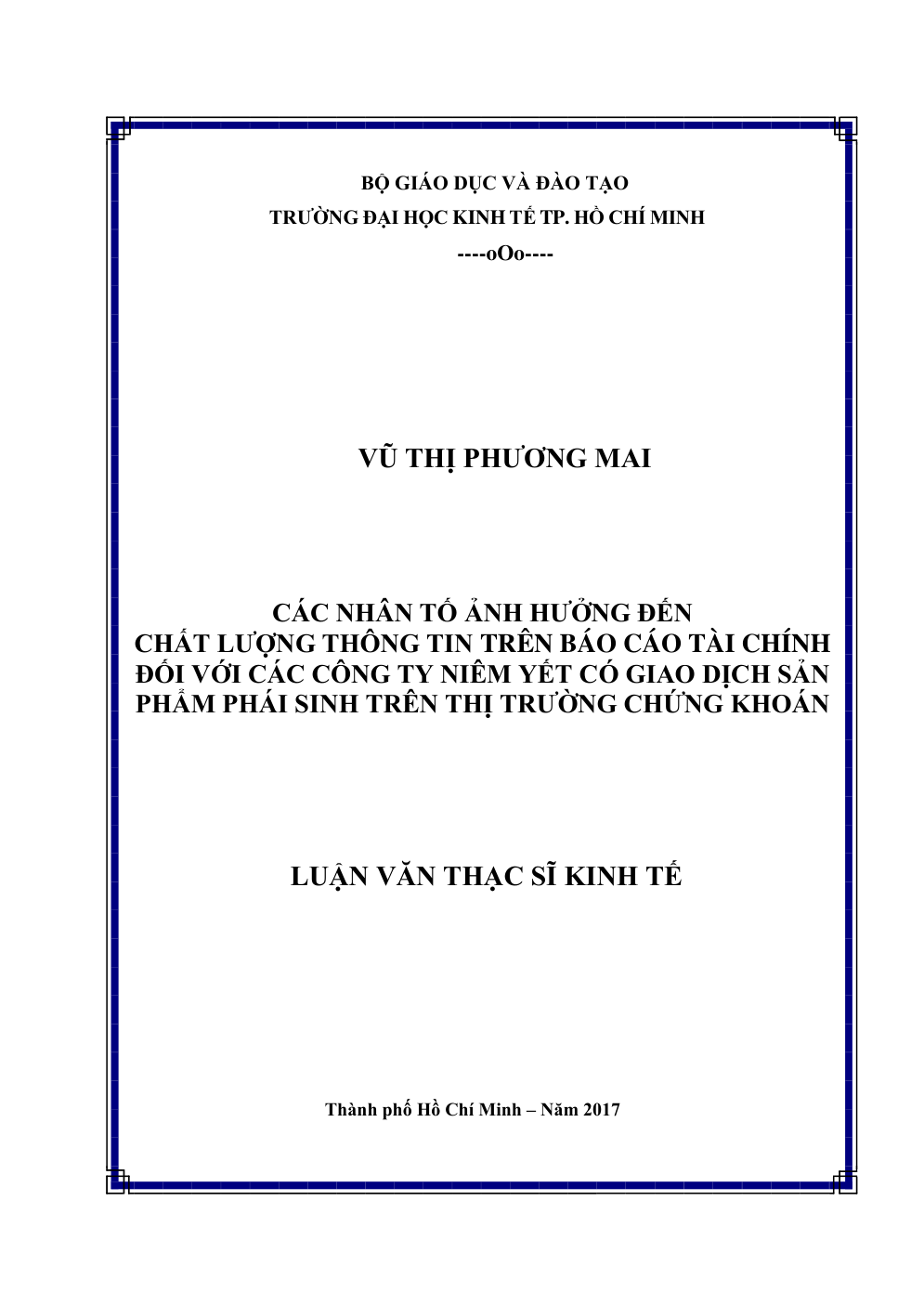 - Tên Luận văn: Các nhân tố ảnh hưởng đến chất lượng thông tin trên báo cáo tài chính đối với các công ty niêm yết có giao dịch sản phẩm phái sinh trên thị trường chứng khoán