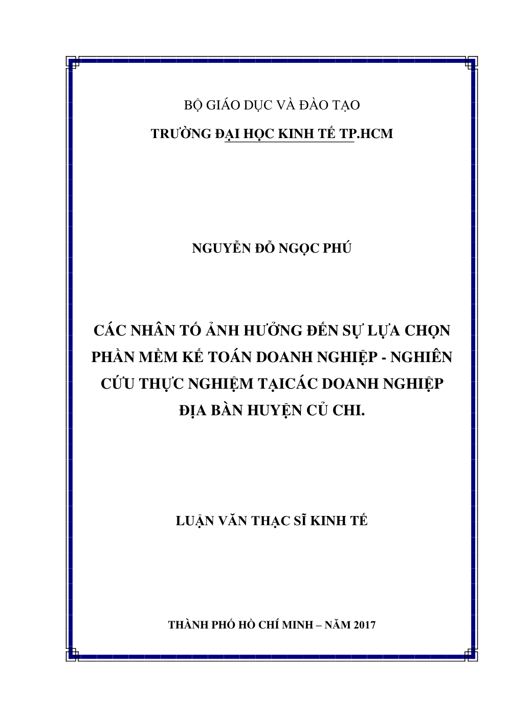 • Tên Luận văn: Các nhân tố ảnh hưởng đến sự lựa chọn phần mềm kế toán doanh nghiệp – Nghiên cứu thực nghiệm tại các doanh nghiệp địa bàn Huyện Củ Chi.