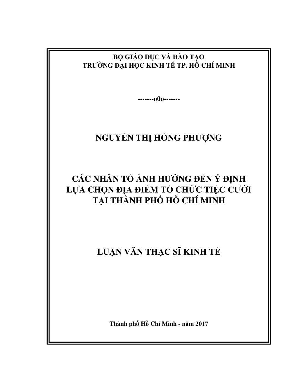 • Tên Luận văn: CÁC NHÂN TỐ ẢNH HƯỞNG ĐẾN Ý ĐỊNH LỰA CHỌN ĐỊA ĐIỂM TỔ CHỨC TIỆC CƯỚI TẠI THÀNH PHỐ HỒ CHÍ MINH