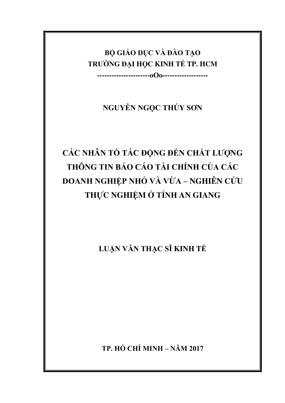 - Tên Luận văn: Các nhân tố tác động đến chất lượng thông tin trên báo cáo tài chính (BCTC) của các doanh nghiệp nhỏ và vừa (DNNVV) – nghiên cứu thực nghiệm ở An Giang.