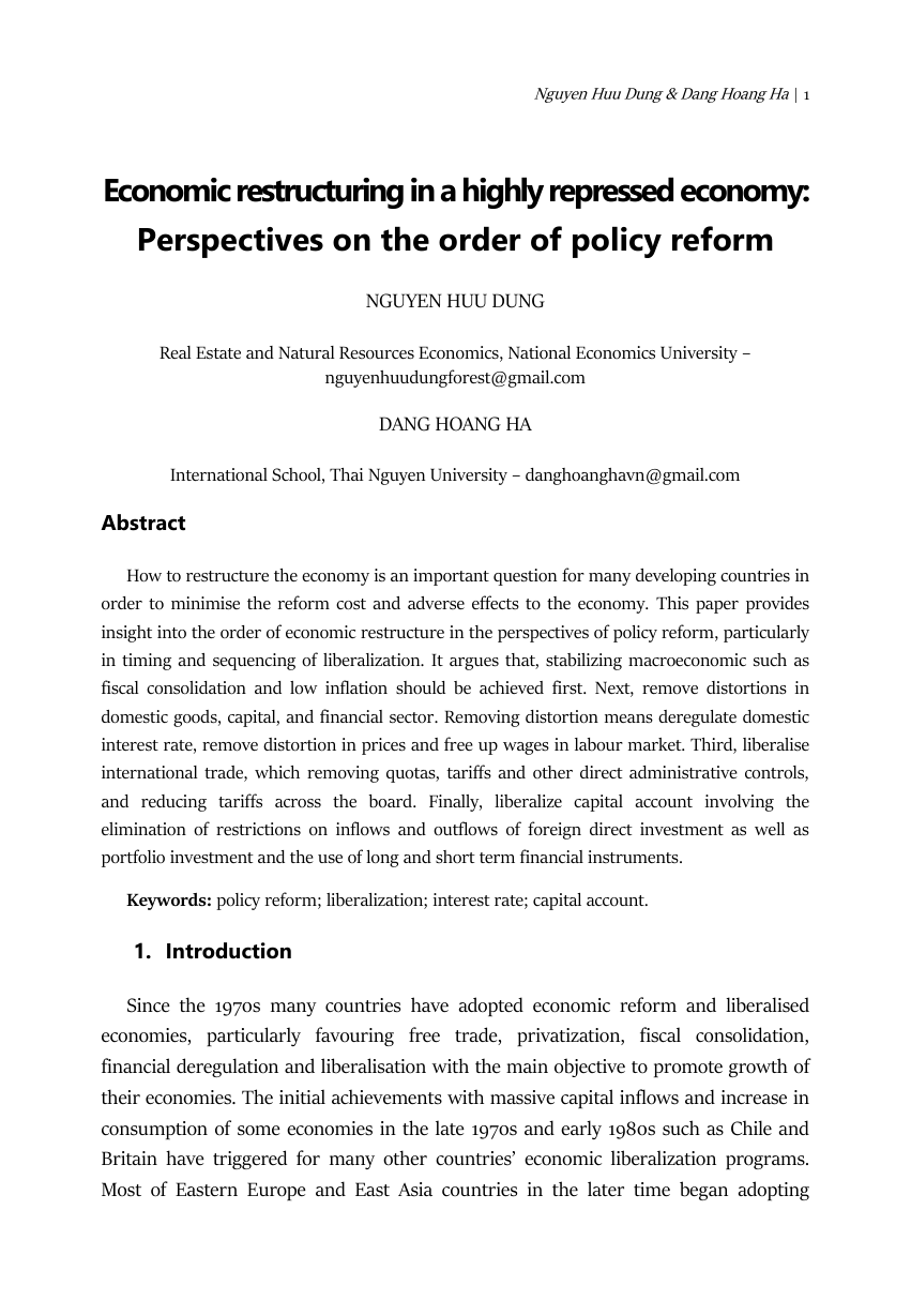 • Tên Luận văn (Bài báo): Economic restructuring in a highly repressed economy: Perspectives on the order of policy reform (Tái cơ cấu kinh tế trong một nền kinh tế bị kìm nén cao: Quan điểm về trình tự cải cách chính sách)