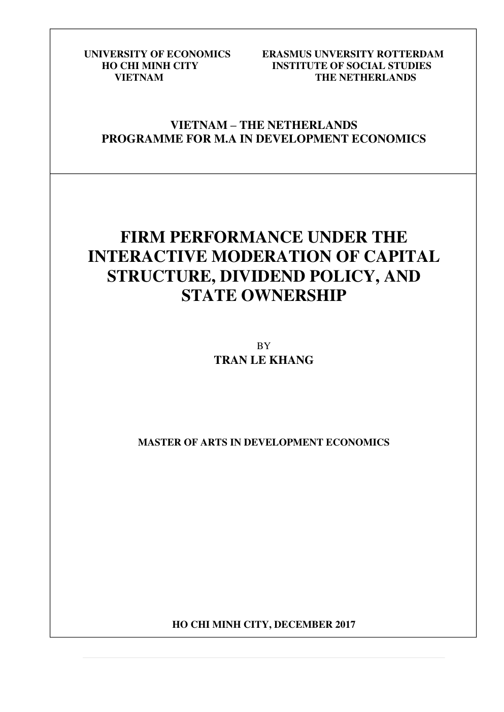 - Tên Luận văn: Hiệu quả hoạt động của doanh nghiệp dưới sự điều tiết tương tác của cấu trúc vốn, chính sách cổ tức và sở hữu nhà nước (FIRM PERFORMANCE UNDER THE INTERACTIVE MODERATION OF CAPITAL STRUCTURE, DIVIDEND POLICY, AND STATE OWNERSHIP)