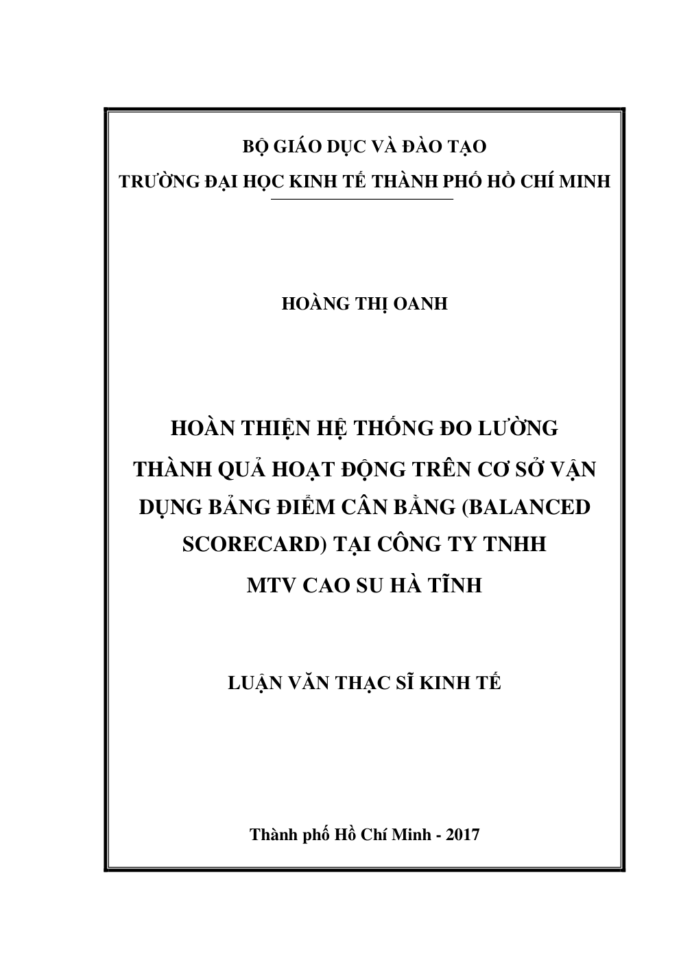 - Tên Luận văn: Hoàn thiện hệ thống đo lường thành quả hoạt động trên cơ sở vận dụng bảng điểm cân bằng (Balanced Scorecard) tại Công ty TNHH MTV Cao su Hà Tĩnh