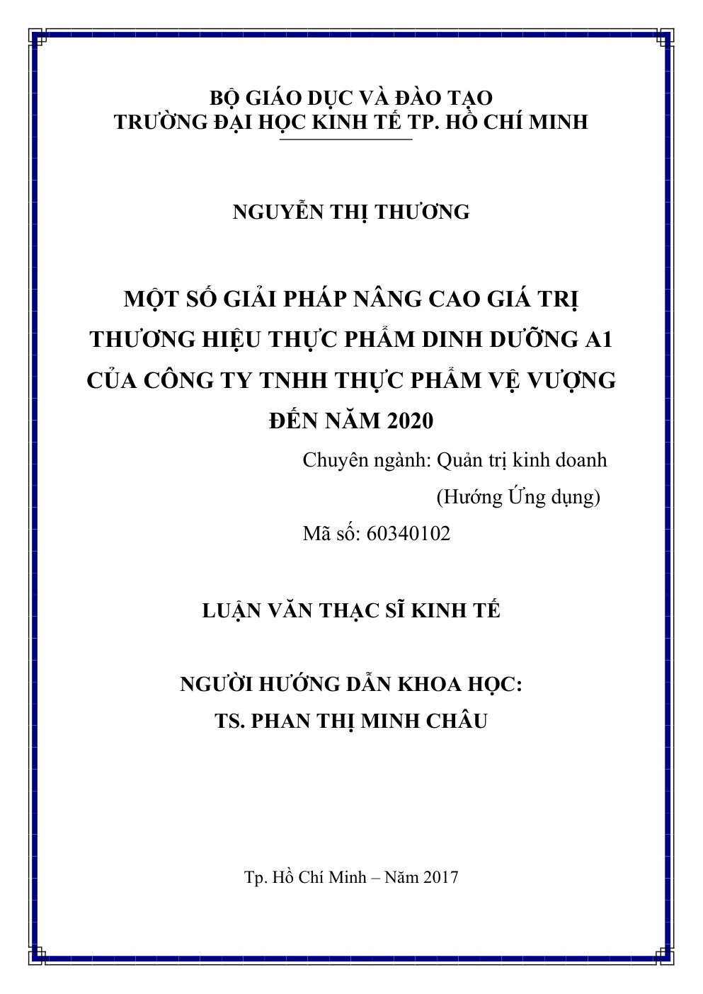 - Tên Luận văn: Một số giải pháp nâng cao giá trị thương hiệu thực phẩm dinh dưỡng A1 của Công ty TNHH Thực phẩm Vệ Vượng đến năm 2020