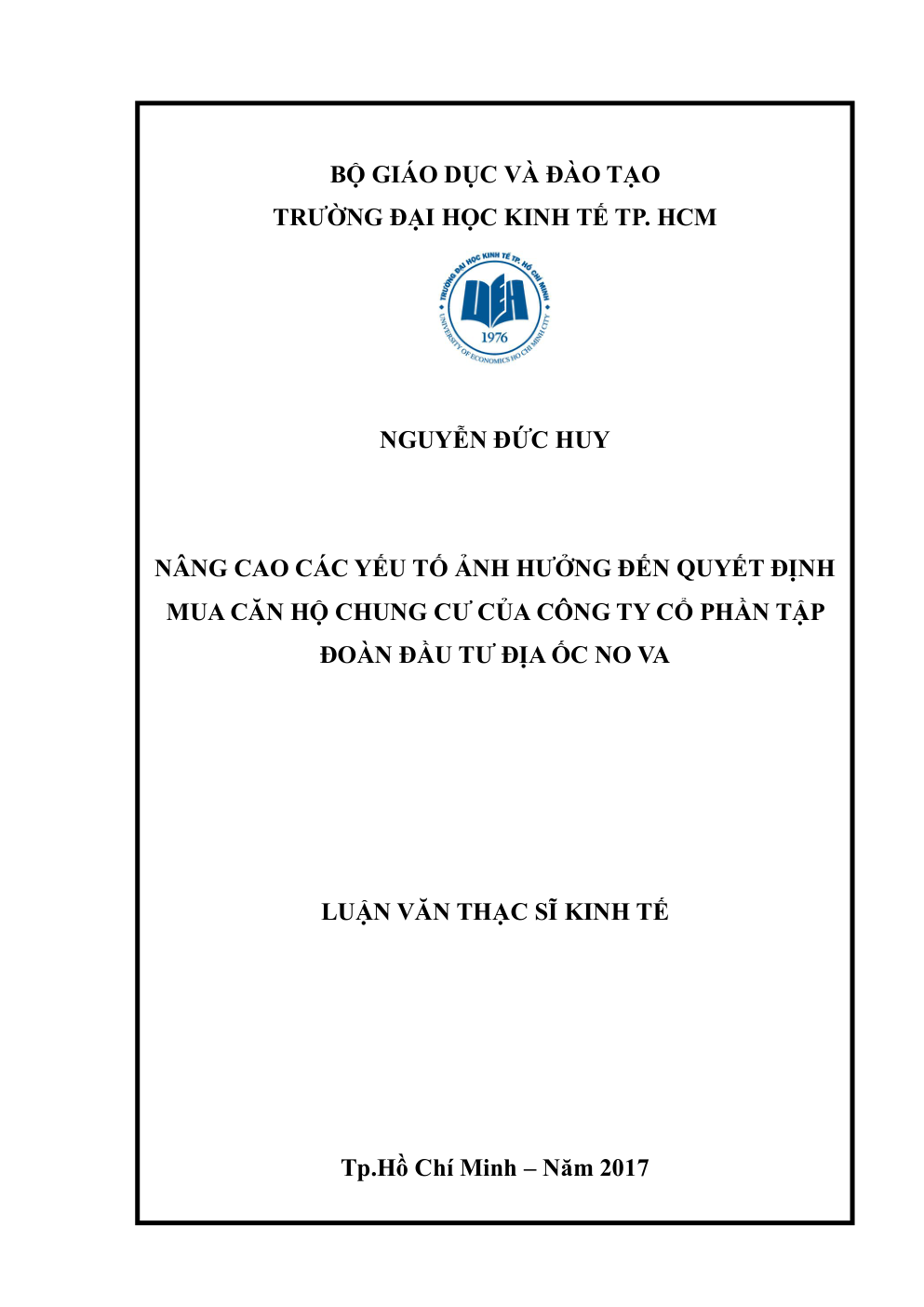 - Tên Luận văn: NÂNG CAO CÁC YẾU TỐ ẢNH HƯỞNG ĐẾN QUYẾT ĐỊNH MUA CĂN HỘ CHUNG CƯ CỦA CÔNG TY CỔ PHẦN TẬP ĐOÀN ĐẦU TƯ ĐỊA ỐC NO VA