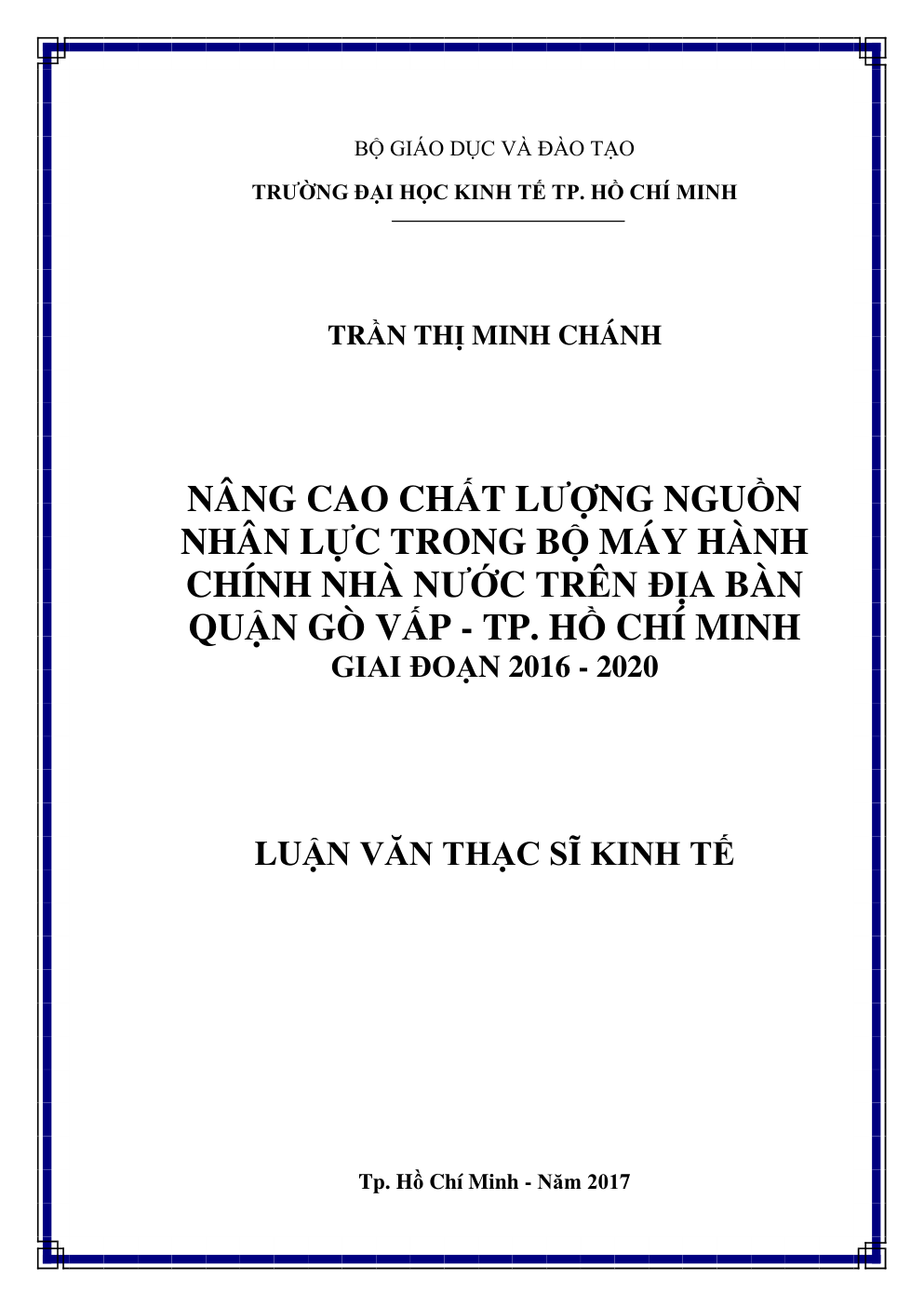 - Tên Luận văn thạc sĩ: Nâng cao chất lượng nguồn nhân lực trong bộ máy hành chính nhà nước trên địa bàn Quận Gò Vấp – TP. Hồ Chí Minh giai đoạn 2016 – 2020