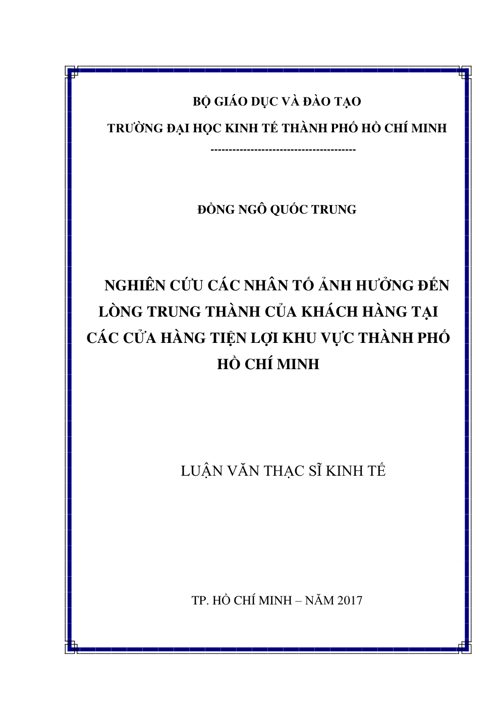 - Tên Luận văn: NGHIÊN CỨU CÁC NHÂN TỐ ẢNH HƯỞNG ĐẾN LÒNG TRUNG THÀNH CỦA KHÁCH HÀNG TẠI CÁC CỬA HÀNG TIỆN LỢI KHU VỰC THÀNH PHỐ HỒ CHÍ MINH