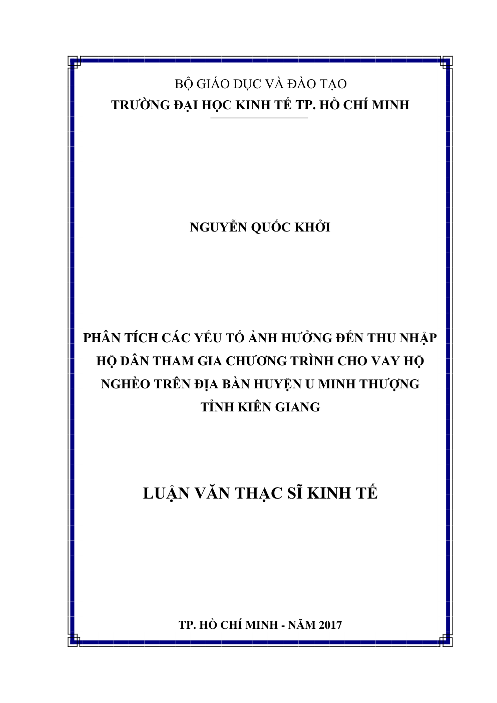- Tên Luận văn: Phân tích các yếu tố ảnh hưởng đến thu nhập hộ dân tham gia chương trình cho vay hộ nghèo trên địa bàn huyện U Minh Thượng tỉnh Kiên Giang