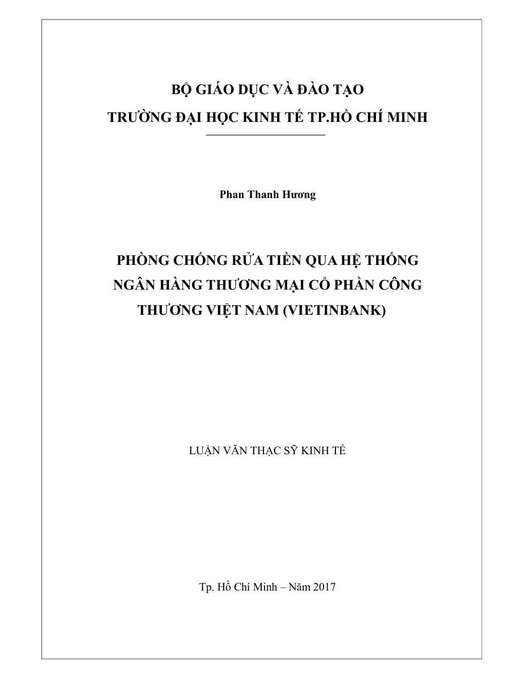 • Tên Luận văn: Phòng chống rửa tiền qua hệ thống Ngân hàng Thương mại Cổ phần Công Thương Việt Nam (Vietinbank)