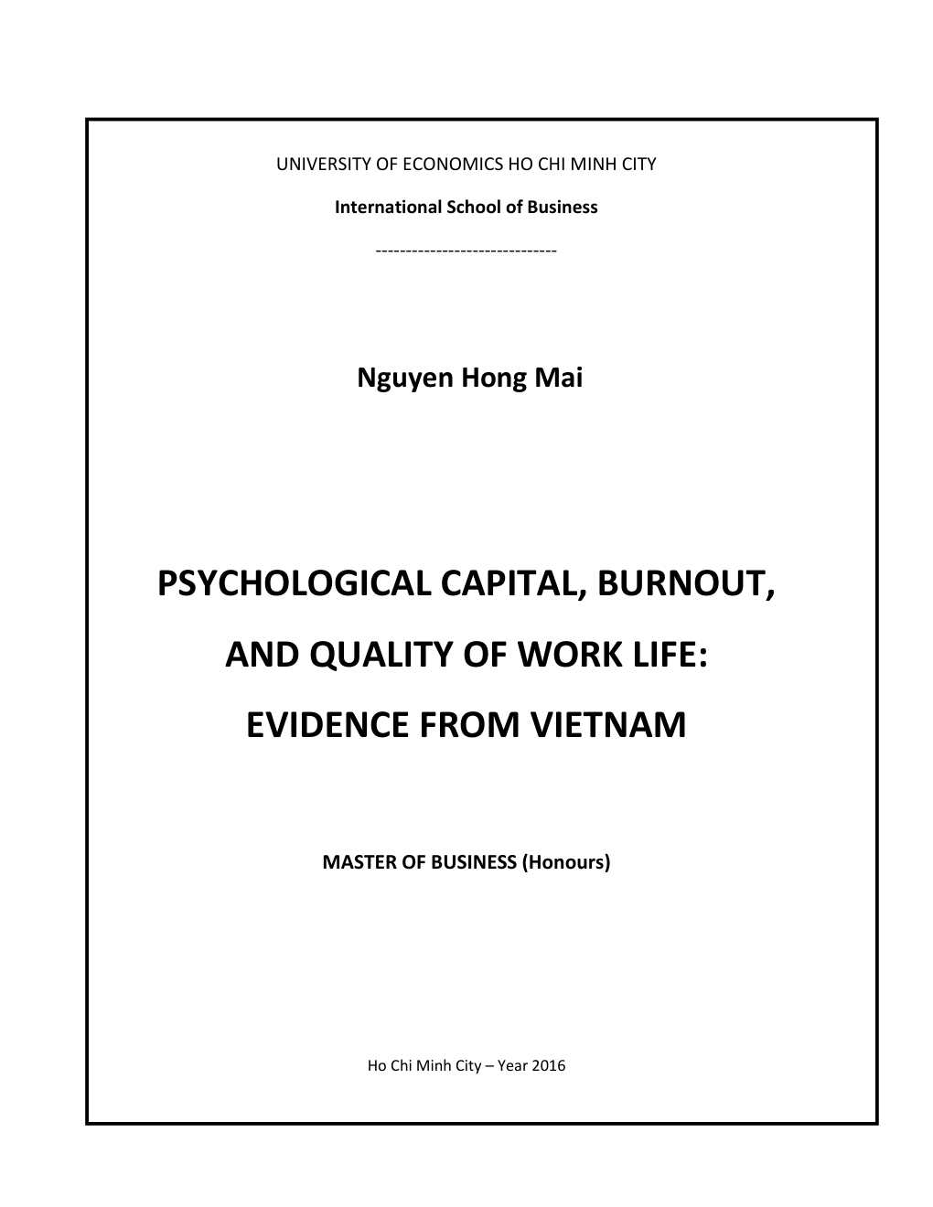 - Tên Luận văn: PSYCHOLOGICAL CAPITAL, BURNOUT, AND QUALITY OF WORK LIFE: EVIDENCE FROM VIETNAM (VỐN TÂM LÝ, KIỆT SỨC VÀ CHẤT LƯỢNG CUỘC SỐNG CÔNG VIỆC: BẰNG CHỨNG TỪ VIỆT NAM)
