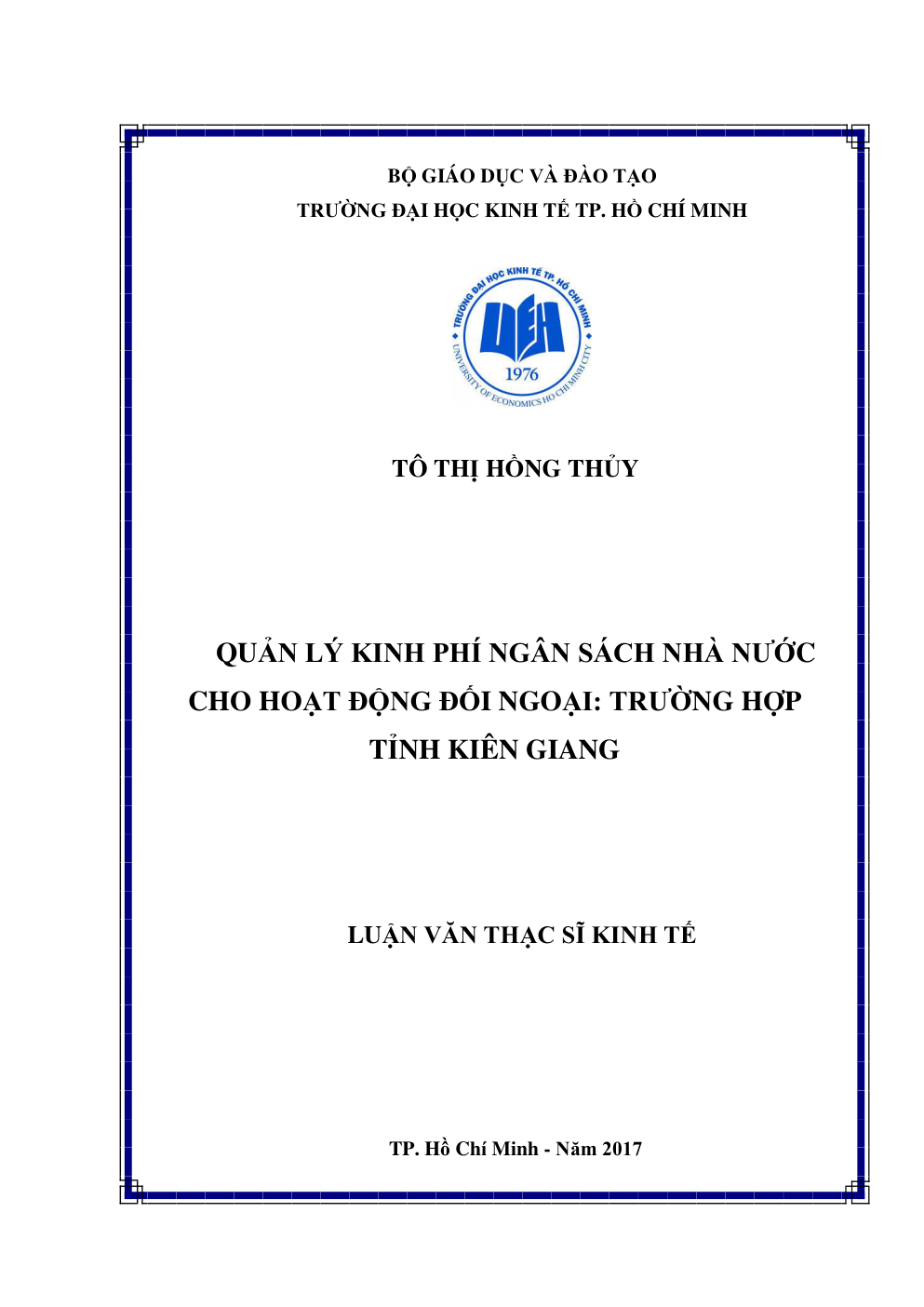 - Tên Luận văn: QUẢN LÝ KINH PHÍ NGÂN SÁCH NHÀ NƯỚC CHO HOẠT ĐỘNG ĐỐI NGOẠI: TRƯỜNG HỢP TỈNH KIÊN GIANG