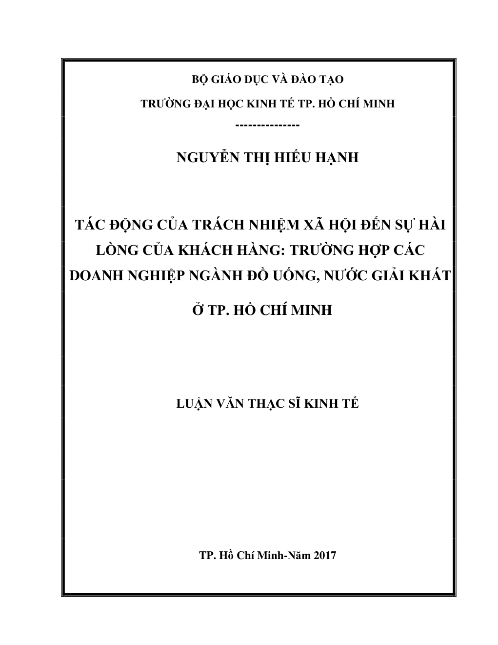 - Tên Luận văn: TÁC ĐỘNG CỦA TRÁCH NHIỆM XÃ HỘI ĐẾN SỰ HÀI LÒNG CỦA KHÁCH HÀNG: TRƯỜNG HỢP CÁC DOANH NGHIỆP NGÀNH ĐỒ UỐNG, NƯỚC GIẢI KHÁT Ở TP. HỒ CHÍ MINH
