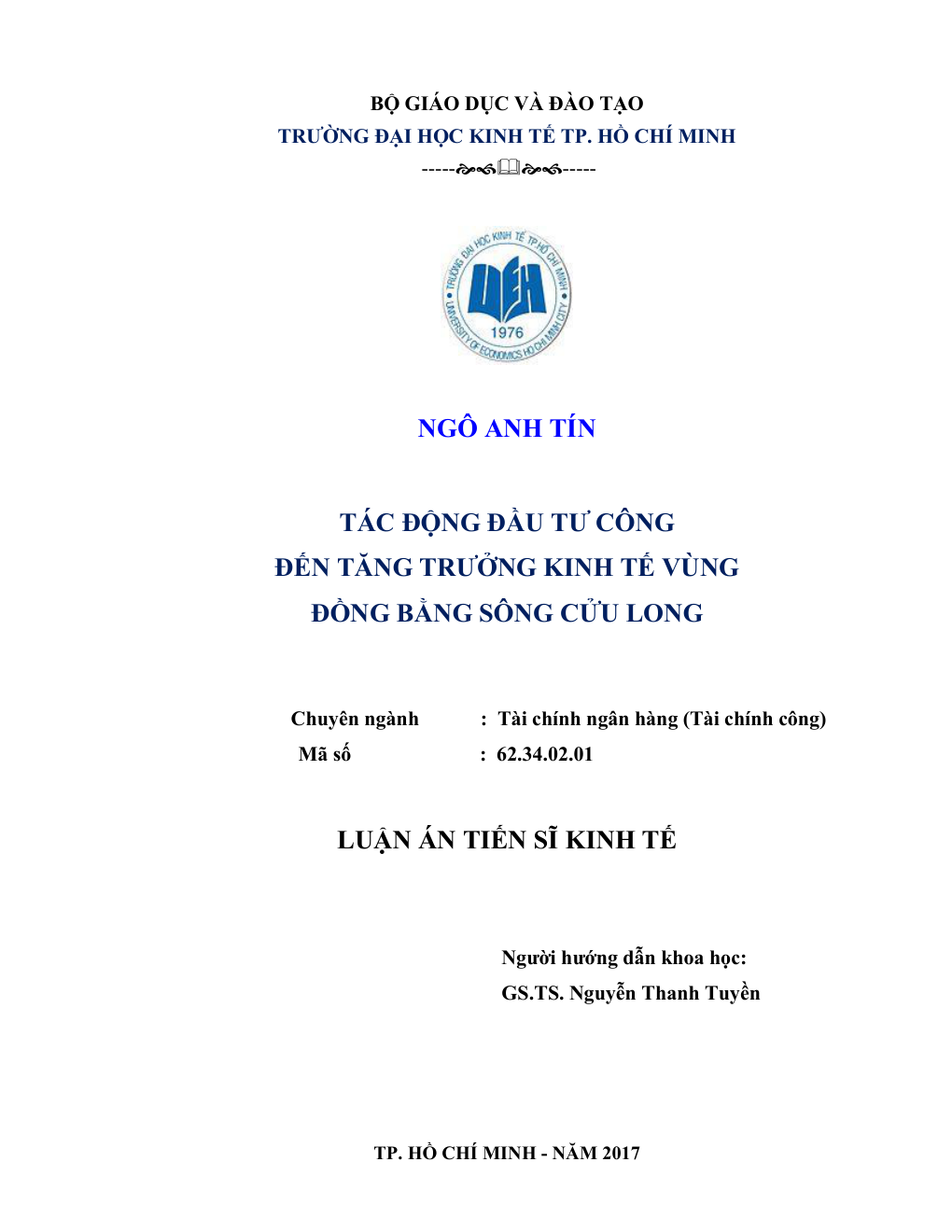 • Tên Luận văn: TÁC ĐỘNG ĐẦU TƯ CÔNG ĐẾN TĂNG TRƯỞNG KINH TẾ VÙNG ĐỒNG BẰNG SÔNG CỬU LONG