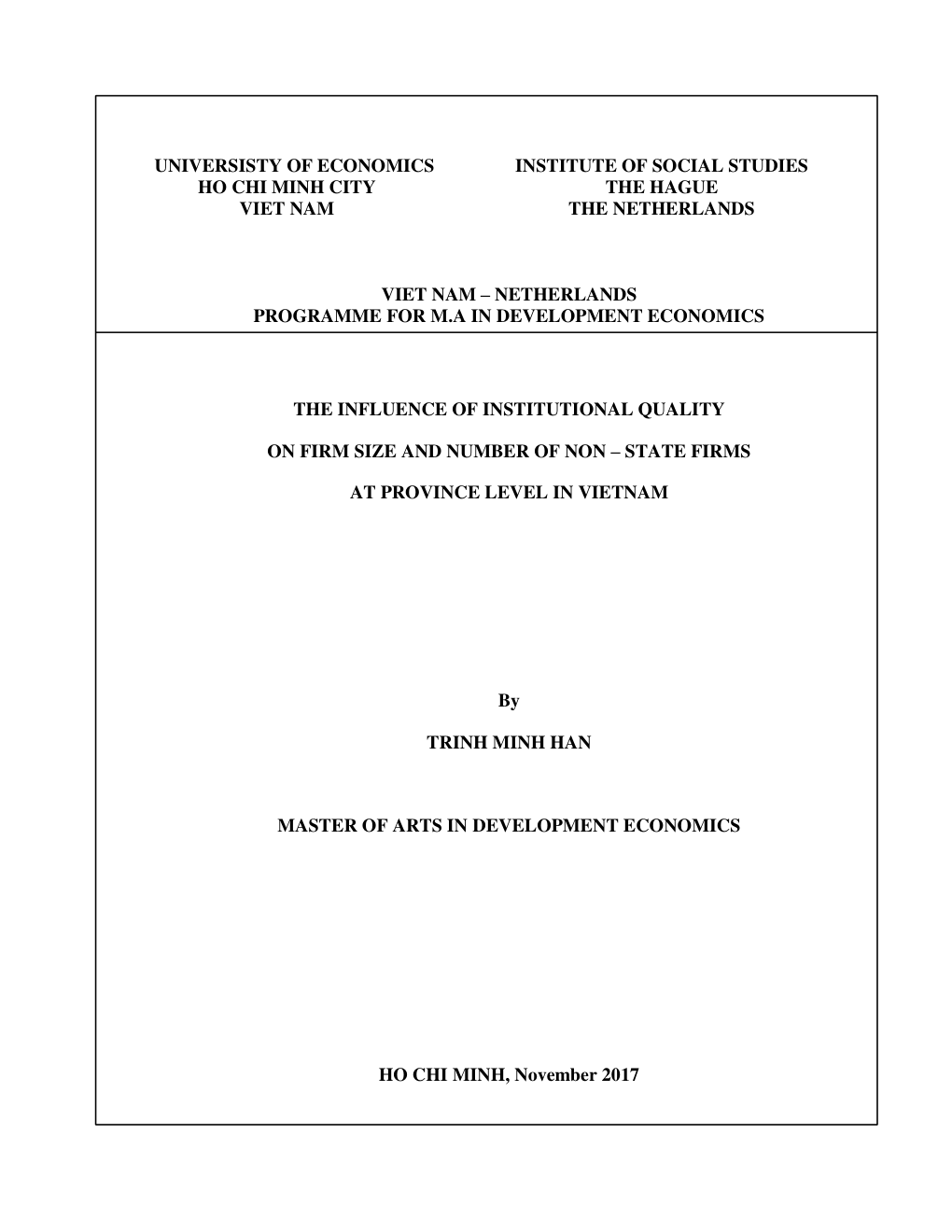 - Tên Luận văn: The Influence of Institutional Quality on Firm Size and Number of Non-State Firms at Province Level in Vietnam (Ảnh hưởng của chất lượng thể chế đến quy mô doanh nghiệp và số lượng doanh nghiệp ngoài quốc doanh ở cấp tỉnh tại Việt Nam).