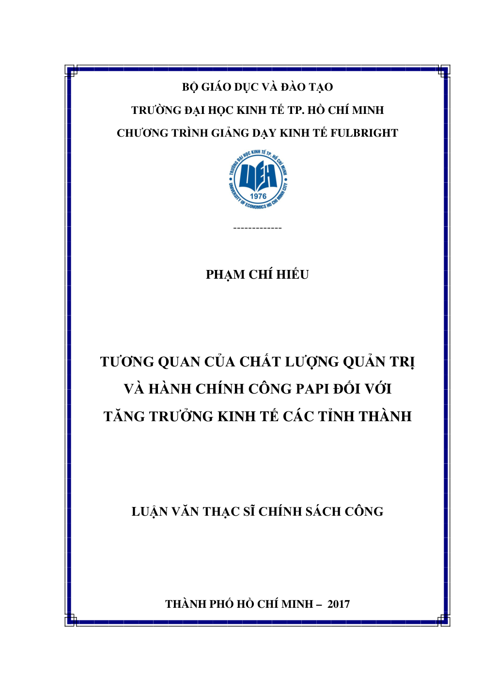- Tên Luận văn: TƯƠNG QUAN CỦA CHẤT LƯỢNG QUẢN TRỊ VÀ HÀNH CHÍNH CÔNG PAPI ĐỐI VỚI TĂNG TRƯỞNG KINH TẾ CÁC TỈNH THÀNH