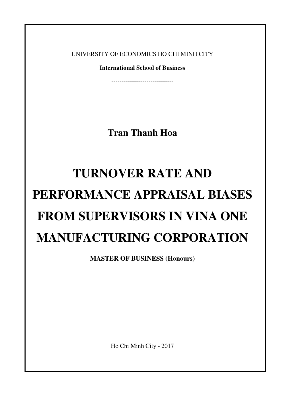 - Tên Luận văn: Tỷ lệ luân chuyển lao động và các sai lệch trong đánh giá hiệu suất của cấp quản lý trực tiếp tại Công ty Cổ phần Sản xuất Vina One (TURNOVER RATE AND PERFORMANCE APPRAISAL BIASES FROM SUPERVISORS IN VINA ONE MANUFACTURING CORPORATION)